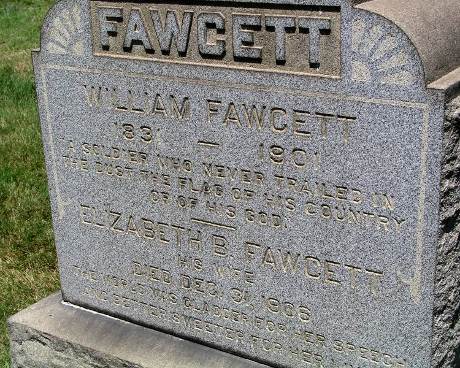 According to the censuses of 1880 and 1900 and the Brooklyn Directory for 1888-1890, Fawcett owned a saddlery and hardware manufacturing business at 97 Cliff Street in Manhattan. He was granted an invalid pension in 1890, certificate 834,877. Fawcett was a member of the Ulysses S. Grant Post #327 of the G.A.R. and was treasurer of his church’s Sunday school for a generation. His last residence was 239 Van Buren Street in Brooklyn. His death was attributed to “shock operation.” In 1901, Elizabeth Fawcett, who is interred with him, applied for and received a widow’s pension, certificate 548,922. Section 187, lot 18952, grave 6.