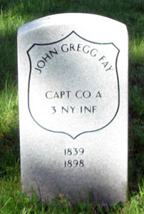 FAY, JOHN GREGG (1839-1898). Captain, 3rd New York Infantry, Company A. Born in Westchester, New York, he was a descendant of Lord Pell of Pelham Manor, the holder of the Long Reach Patent, which he transferred to the Huguenots, giving them possession of New Rochelle, New York, in the early part of the eighteenth century. Fay enlisted on April 17, 1861, at Albany, New York, as a first lieutenant, was commissioned into the 3rd New York on May 14, and was promoted to captain on July 2 of that year. As a captain, he commanded the 3rd New York at the siege and defense of Suffolk, Virginia, from April 11 to May 4, 1863. He was dismissed from the service on May 24, 1864, but that dismissal was reversed and he was honorably discharged.