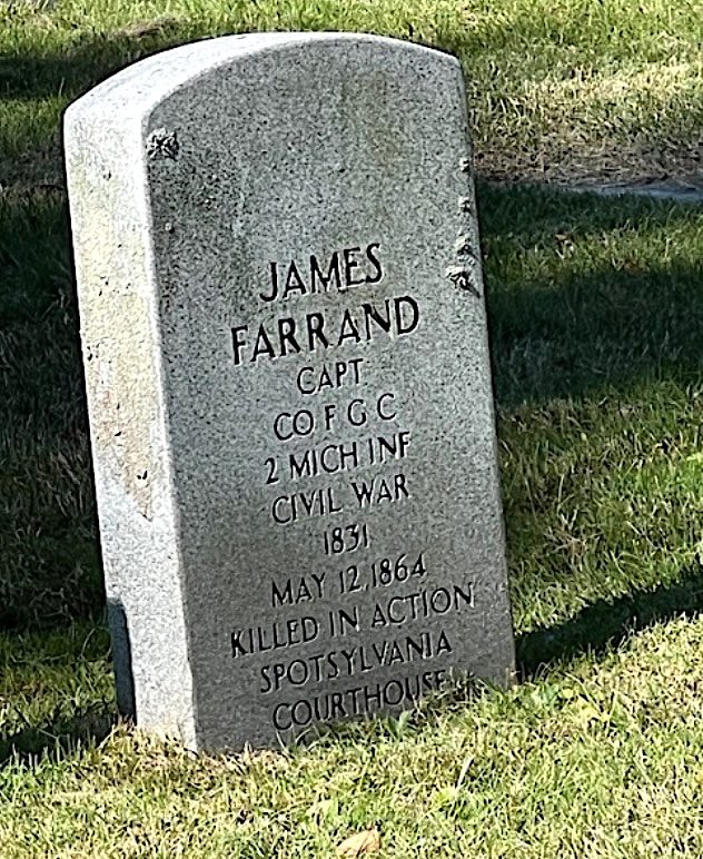 FARRAND, JAMES (1831-1864). Captain, 2nd Michigan Infantry, Companies F, G, and C. Of English birth and a resident of Flint, Michigan, he enlisted there as a first lieutenant on April 23, 1861, and was commissioned into Company F on May 25. According to a biographical entry on “Find A Grave,” he was from a Quaker family and was so opposed to slavery that he was determined to fight to end that institution in his adopted country. He was transferred to Company G on March 6, 1862, and promoted to captain on August 1, 1862, effective upon his transfer to Company C. Wounded at Campbell’s Station, Tennessee, on November 16, 1863, he recovered and returned to action, only to be killed in battle on May 12, 1864, at Spotsylvania Court House, Virginia. Brigadier General J. F. Hartranft, United States Army, wrote of that engagement in his field report of October 25, 1864, “…the Second Michigan, under the command of the gallant Captain James Farrand, repulsed the enemy most handsomely. After all the gunners were killed or wounded, he manned the guns from his regiment, but he was killed soon after while bravely directing the fire of the pieces he had so hastily manned…” Farrand was originally buried at Spotsylvania, then his remains were moved to Fredericksburg, Virginia, by his commanding officer. After his father claimed his remains, Farrand was interred at Green-Wood on November 9, 1865. Section 117, lot 15223.