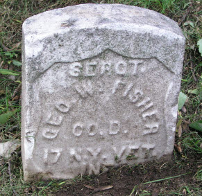 FISHER, GEORGE W. (1843-1916). Sergeant, 17th New York Infantry, Companies F and D. Born in New York City, he enlisted there on October 9, 1863, as a private, and mustered into Company F of the 17th Infantry on October 13. On November 1, 1863, he transferred into Company D and was promoted to first sergeant. After being reduced in rank to private on February 7, 1865, he was promoted to sergeant on March 1, 1865, and mustered out on July 13, 1865, at Alexandria, Virginia.