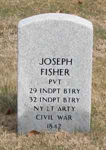 FISHER, JOSEPH (1842-1874). Private, 29th New York Light Artillery; 32nd New York Light Artillery. Born in Bavaria, Germany, Fisher was a baker by trade. He enlisted on March 31, 1864, at New York City, and mustered into the 29th Light Artillery (unknown company) that day. According to his muster roll, he was 5′ 5¾” tall with blue eyes, brown hair and a sallow complexion. He transferred into the 32nd New York Light Artillery (unknown company) on August 15, 1864, and mustered out on June 8, 1865, at Parkersburg, West Virginia. His last residence was on Pacific Street in East New York, Brooklyn. Phthisis pulmonalis was listed as the cause of his death. Section 55, lot 9366.