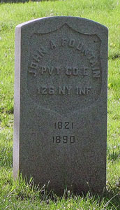 FOUNTAIN, JOHN A. (1821-1890). Private, 126th New York Infantry, Company E; Veteran Reserve Corps, 2nd Battalion. A New York State native, Fountain enlisted on April 11, 1864, at Gorham, New York, as a private. On that date he mustered into the 126th New York. He transferred into the 2nd Battalion of the Veteran Reserve Corps as a private on January 1, 1865, and mustered out on August 4, 1865, at Washington, D.C. His last residence was 50 3rd Avenue in Brooklyn but died in Kings County Insane Asylum where he was suffering from dementia. Section 44, lot 4684.