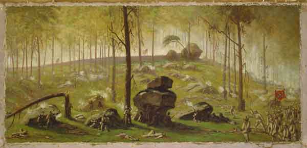 The Regiment advanced to the trenches at double-quick, cheering and shouting, and remained there fighting until our ammunition was exhausted. I ordered each man to retain a load in his rifle to be used while being relieved. The men fought in the trenches with great coolness, many of them standing up and looking around for a good range before firing…”