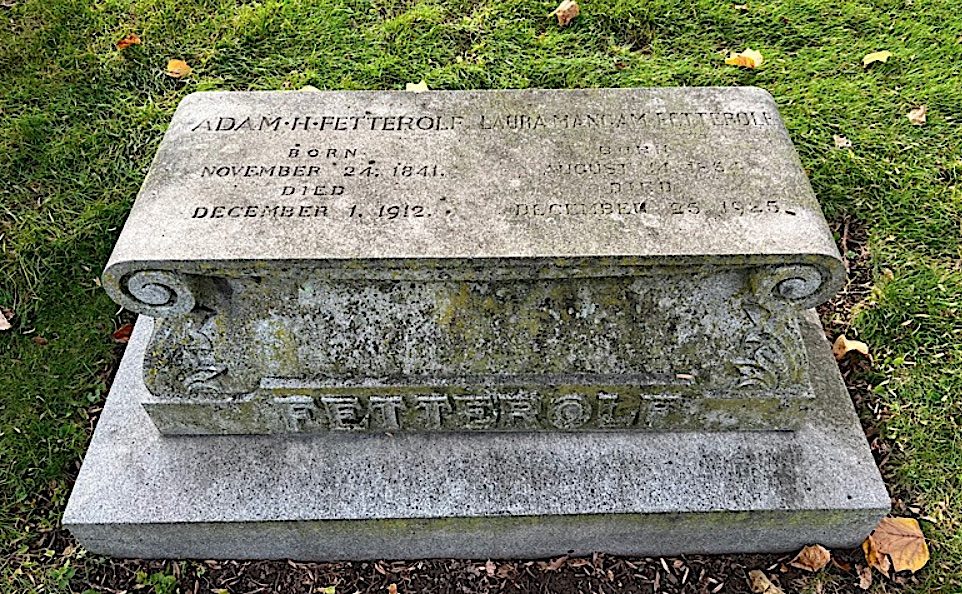 Among the many organizations to which Fetterolf belonged were the Historical Society of Pennsylvania, the American Academy of Political and Social Science, and the Art, City, Geographical and Contemporary Clubs. The Veterans Schedule of 1890 confirms his Civil War service. His last residence was 1936 Pine Street in Philadelphia, Pennsylvania. Fetterolf died of an intestinal obstruction. His second wife, Laura Mangam Fetterolf, who is interred with him, was the daughter of a wealthy New York merchant. Section 81, lot 18133.