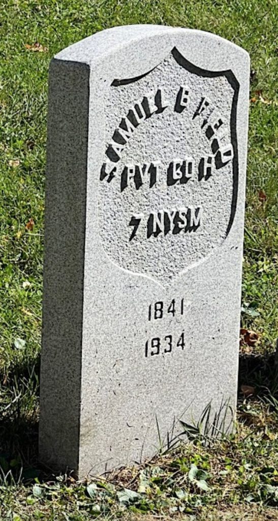 FIELD, SAMUEL B. (1841-1934). Private, 7th Regiment, New York State Militia, Company H. Born in New York City, Field enlisted a private on April 17, 1861, served in the 7th Regiment during its 30-day activation, and mustered out on June 3. In 1932, he applied for a pension, application 1,716,960, but there is no evidence that it was certified. He was the brother of Robert Field (see). He last lived at 146 Garfield Avenue in Plainfield, New Jersey. The cause of his death was arteriosclerosis. Section 82, lot 3430.