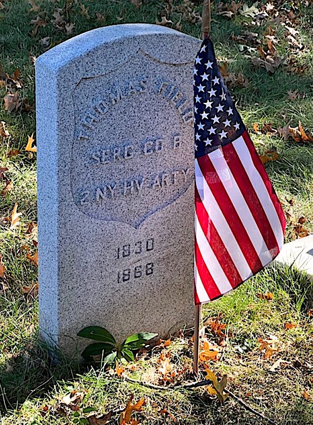 FIELD, THOMAS (1830-1868). Private, 2nd New York Heavy Artillery, Company B. A native of Ireland, Field enlisted at New York City as a sergeant on September 17, 1861, and mustered into the 2nd New York Heavy Artillery the next day. Six days later, he deserted at Staten Island. He last lived at 12 Thompson Street in Manhattan. Section 121, lot 11189, grave 169.