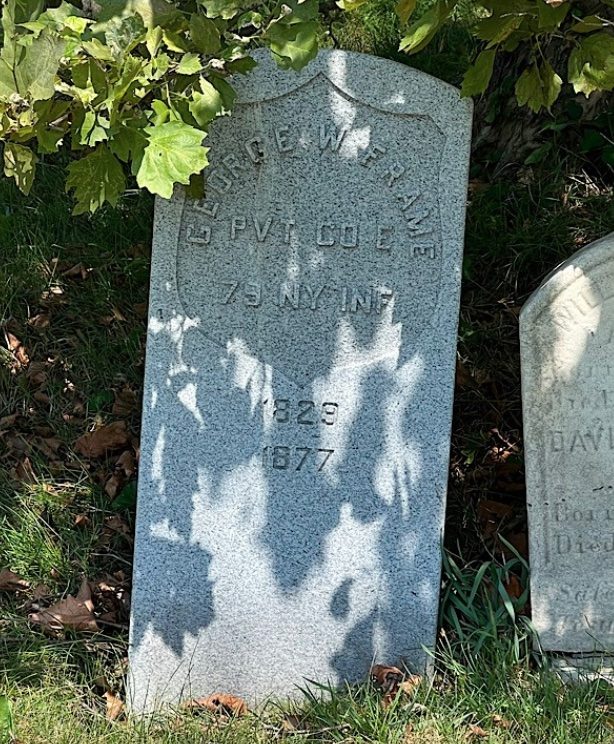 FRAME, GEORGE W. (1829-1877). Private, 79th New York Infantry, Company E. Of Irish origin, Frame enlisted as a private on August 26, 1862, at New York City, and mustered immediately into the 79th New York. As per his muster roll, he was a shoemaker who was 5′ 7″ tall with blue eyes, sandy colored hair and a fair complexion. The muster roll indicates that he was absent without leave March 24 through April 2, 1864; ultimately, he deserted on June 7, 1863, at Louisville, Kentucky. His last residence was 91 Grand Street in Hoboken, New Jersey. He died from pneumonia. Section 40, lot 5436.