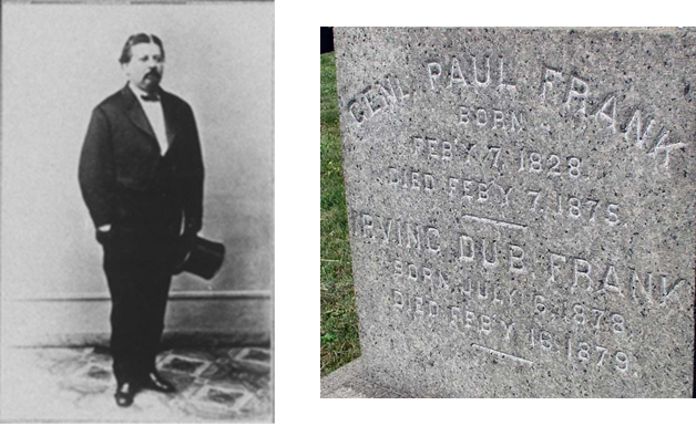 Frank was a fire and marine insurance broker who headed the firm Frank & DuBois in Manhattan. In addition, he was a founder of the Brooklyn Riding and Driving Club and served on its Board of Directors. His last residence was at 21 Montgomery Place in Brooklyn. He succumbed to diabetes mellitus. Section 162, lot 15587.