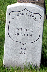FERRY, EDWARD (1814-1876). Private, 79th New York Infantry, Company C. According to the census of 1860, he was a laborer who was born in Ireland. After enlisting as a private at New York City on May 13, 1861, Ferry mustered into the 79th New York on May 28. His son, Andrew Ferry, was in the same regiment and company. Further details of his military service are not known. He applied for and was granted an invalid pension on April 29, 1863, certificate 96,881.