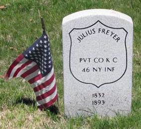 FREYER, JULIUS (1832-1893). Private, 46th New York Infantry, Companies K and C. A German native, Freyer enlisted on September 16, 1861, at New York City, and mustered into Company K of the 46th New York. He had an intra-regimental transfer to Company C on October 31, 1861, and deserted on June 8, 1863, at Cincinnati, Ohio. As per the 1865 Brooklyn Directory and the 1870 census, he was a cabinetmaker. On October 15, 1868, Freyer filed an application for United States citizenship. The 1880 census and the 1892 New York State census indicate that he was still working as a cabinetmaker. He last lived at 258 Union Street in Brooklyn. He succumbed to heart disease. Section 115, lot 4196, grave 812.