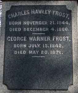 FROST, CHARLES HAWLEY (1844-1866). Private, 159th New York Infantry, Company I. A New York State native, Frost enlisted at Brooklyn and mustered into the 159th New York on November 20, 1863, and mustered out of service at Augusta, Georgia, on October 12, 1865. His last residence was on DeKalb Avenue in Brooklyn where he died from consumption. Section 21, lot 8872.