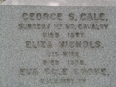 Gale took a medical leave because of malaria for a few weeks in October 1862 and missed a few weeks in the summer of 1863 when he suffered from rheumatism. When his regiment was detailed to James River, Virginia, he was detailed to Cavalry Corps Hospital in City Point, Virginia, where he was for a large part of the time, surgeon-in-chief until the close of the hostilities. Although his obituary and biography note that he served throughout the Civil War, his soldier record indicates that he enlisted as a surgeon on September 24, 1864, was commissioned into the Field and Staff of the 1st Vermont Cavalry that day, and mustered out on November 18, 1864. On February 9, 1866, he was appointed surgeon of the New York City Pension Board. He last lived with his daughter at 107 Macon Street in Brooklyn. In the early 1870s, he moved to Brooklyn to practice medicine but was struck with paralysis about three years before his death; he never fully recovered. His death was attributed to necrencephalus (softening of the brain). Section 115, lot 21150.