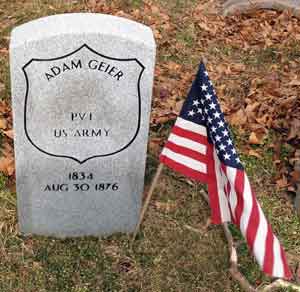 GEYER (or GEIER), ADAM (1844-1876). Private, New York Independent Corps Light Artillery (Enfants Perdus), Company G; 47th New York Infantry, Company H. A native of Germany, he enlisted in the Independent Corps on March 24, 1862, at New York City. He transferred into the 47th on January 30, 1864, and was discharged on May 5, 1865, at Raleigh, North Carolina. He last lived at 130 East 8th Street in New York City. Geyer died of phthisis. Section 115, lot 13536 (Soldiers’ Lot), grave 121.