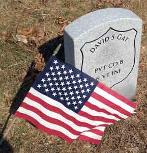 GAY, DAVID S. (1844-1862). Private, 6th Vermont Infantry, Company B. A Vermont native, Gay was living in Chelsea, Vermont, at the time of the 1860 census. He enlisted as a private on September 30, 1861, and mustered into the 6th Vermont on October 15. As per an article on the “Arrival of Sick and Wounded Soldiers” in the New York Tribune on July 14, 1862, Gay’s name is listed as one of the 315 soldiers who arrived from Fortress Monroe, Virginia, aboard the steamer State of Maine the previous day. He was transferred to Long Island College Hospital in Brooklyn where he died from fever (probably typhoid) on July 14, 1862. Interment at Green-Wood was on November 6, 1863. Section 115, lot 13536 (Soldiers’ Lot), grave 78.