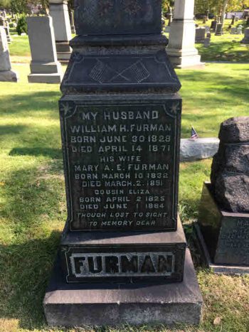 The 1867 Brooklyn Directory lists Furman as a farmer living on Fulton Avenue and Broadway. According to the 1870 census, he was married with three children, lived in Brooklyn and worked as an engineer. He was a member of the Dutch Reformed Church. He last lived on 19th Street in Brooklyn. His death was attributed to consumption. In 1875, Mary A. Furman, who is interred with him, applied for and received a widow’s pension, certificate 174,860. Section 143, lot 22340.