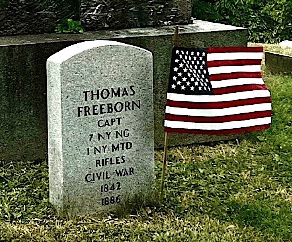 The New York City Directory of 1868 states that he was a merchant. The census of 1880 and the New York City Directory for 1882 indicate that he was a lawyer. Two of his post-war positions were as president of the New York Floating Dry Dock Company and president of the Freeborn Copper Company; the years in which he held those jobs are not known. As per his obituary in the New York Herald, veterans of the 7th Regiment were requested to attend his funeral. His last residence was in Hempstead, Long Island. Acute meningitis was listed as the cause of his death. In 2019, a letter signed by Freeborn accepting an offer to dine with members of the 7th Regiment’s Engineering Corps, hosted by a prominent banker, Georges Jaques, and payment of a $10 subscription fee was offered for sale on eBay. Section 111, lot 12218.
