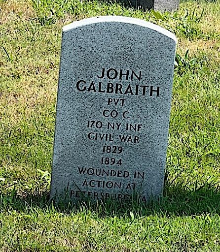 GALBRAITH, JOHN (1829-1894). Private, 170th New York Infantry, Company C. Born in Ireland, Galbraith enlisted as a private at New York City on September 15, 1862, and mustered into the 170th New York on October 7. He was wounded in action at Petersburg, Virginia, on June 24, 1864, and mustered out on July 15, 1865, at Washington, D.C. His last residence was 131 11th Street, Brooklyn. The cause of his death was heart disease. Section 62, lot 24374.