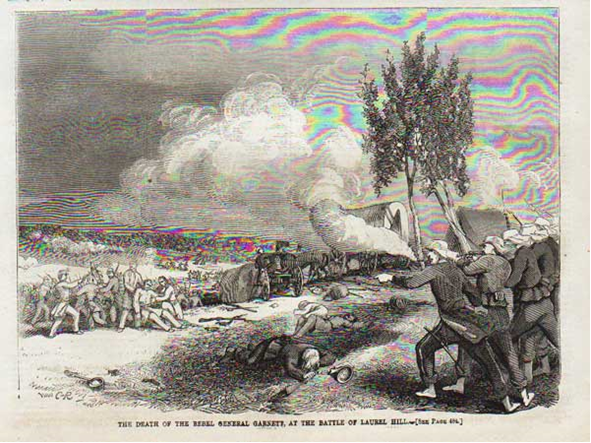 When word reached him in Europe that the Civil War had started, Garnett resigned his commission and returned to his native Virginia to organize Confederate troops. Joining the staff of Robert E. Lee in April 1861, Garnett oversaw the details needed to mobilize Virginia’s citizenry. In June of 1861, he was commissioned brigadier general of the Confederate Army, and given command of forces in the western section of that state. After receiving his command, he said, “They have not given me an adequate force. I can do nothing. They have sent me to my death.” On July 13, 1861, his forces were routed by a body of Union troops six times the size of his command, and he was killed at the Battle of Carrick’s Ford after being struck in the back as he led his rear guard in covering the retreat at Cheat River in western Virginia. At the time he was shot, he was in direct view of Union troops and turned around to see if his men were following him. In an account of that battle by the 14th Ohio troops, Garnett was said to have rallied his men by crying out, “Three cheers for Jeff Davis.” Carrick’s Ford was mired in mud after a summer thunderstorm and the soldiers responded to Union fire in wild confusion.